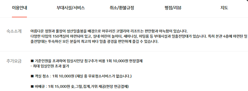 이용 안내란엔 숙소의 소개나 추가요금에 관련된 정보가 있습니다. 아주 중요합니다. 추가인원에 대한 추가요금은 어떻게 되는지, 추가인원의 기준은 어떻게 되는지 확인해보셔야하고 연박일때 객실 청소를 신청했을때 무료인지 유료인지, 1회 비용은 어떻게 되는지 펜션이나 리조트일 경우엔 바베큐 이용요금을 빼놓을 수 없습니다. 숙소 잡는것 보다 더 중요하게 살펴봐야 하는것이 이런 부분들이니 놓치지마시고 챙겨보시기 바랍니다.